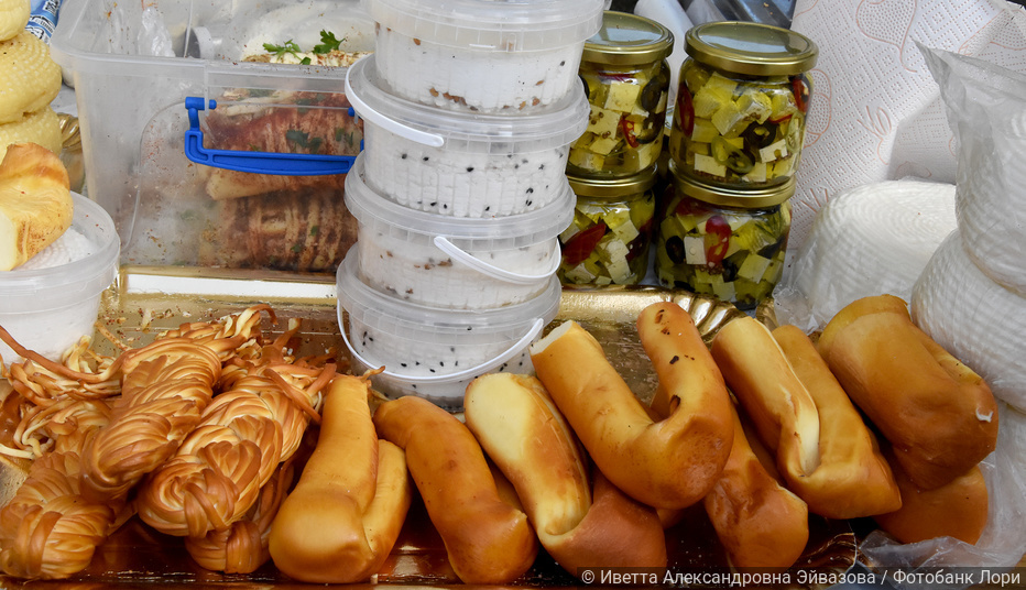 адыгейский сыр, местные фрукты и овощи: помидоры, алыча, грецкий орех долму и шулюм